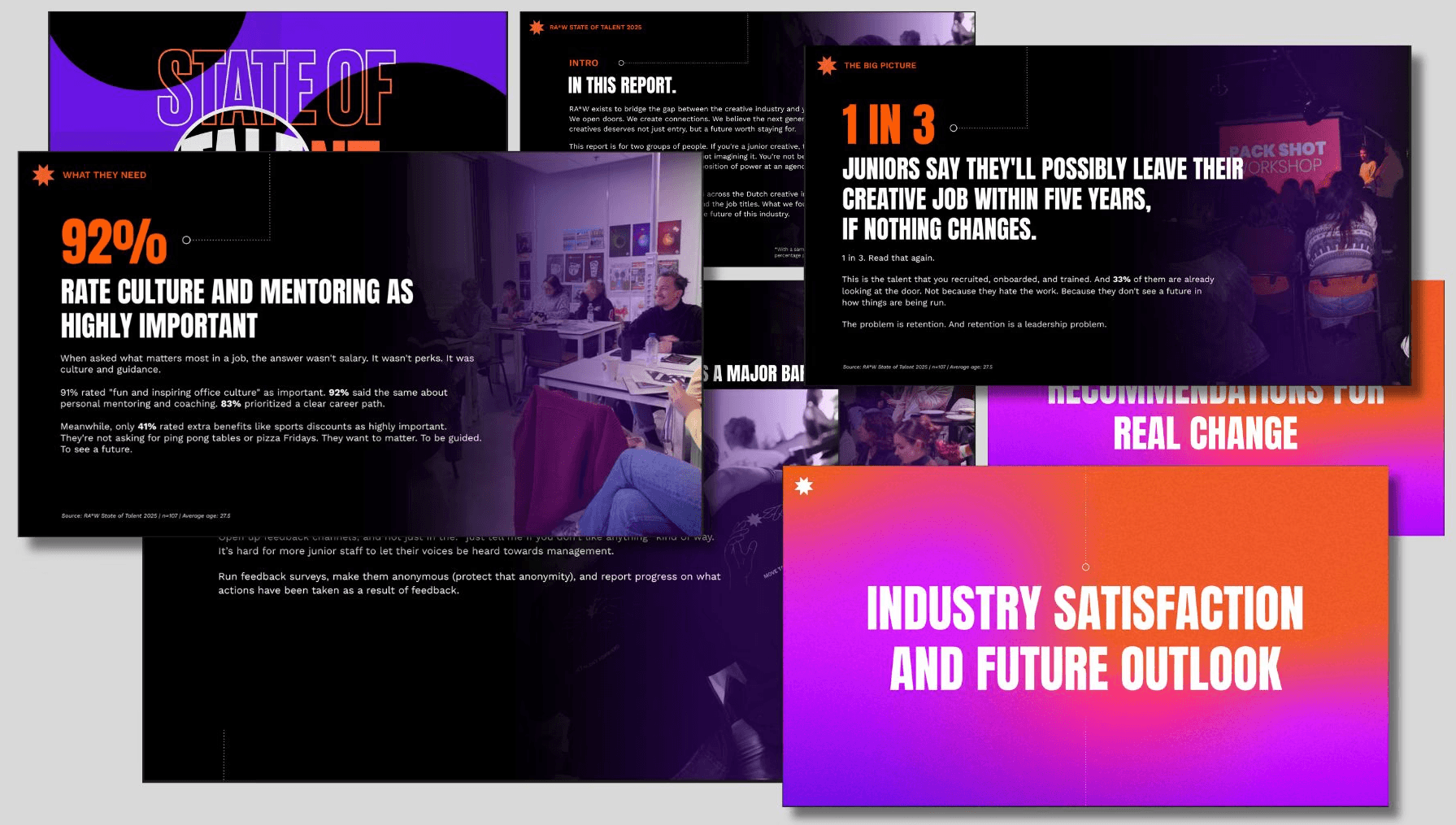 RAW had a strong intuition — something was broken in how the creative industry treated its juniors. Burnout. Talent leaving. A feeling that something was wrong but no data to point at. They needed evidence that could move agency leadership to act.
